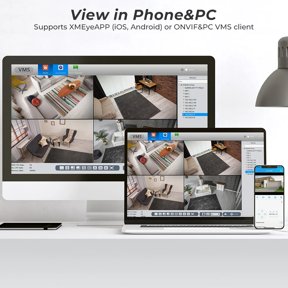 Provide Android & IOS APP And Professional VMS PC Client Software. No matter where you are, you can remotely access the camera to see live streaming and stay connected. Remotely view the camera via APP on your mobile device