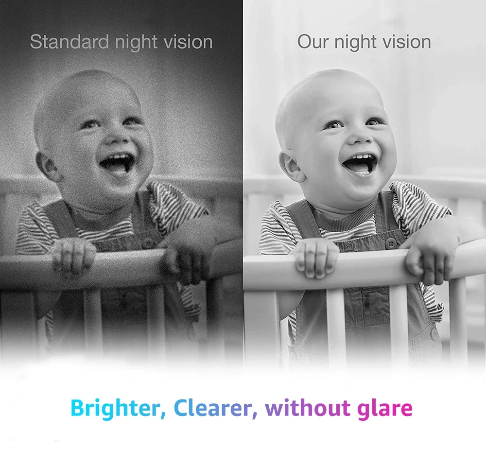 ��【INFRARED NIGHT VISION & 2-WAY AUDIO VIDEO BABY MONITORING】: Crisp night vision gives you a clear view of your little one as they snooze. We are the first brand to adopt the invisible infrared LED baby monitor, you can have a clear video feed at night without disrupting your little baby.