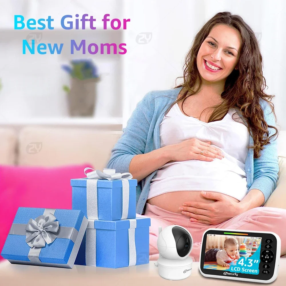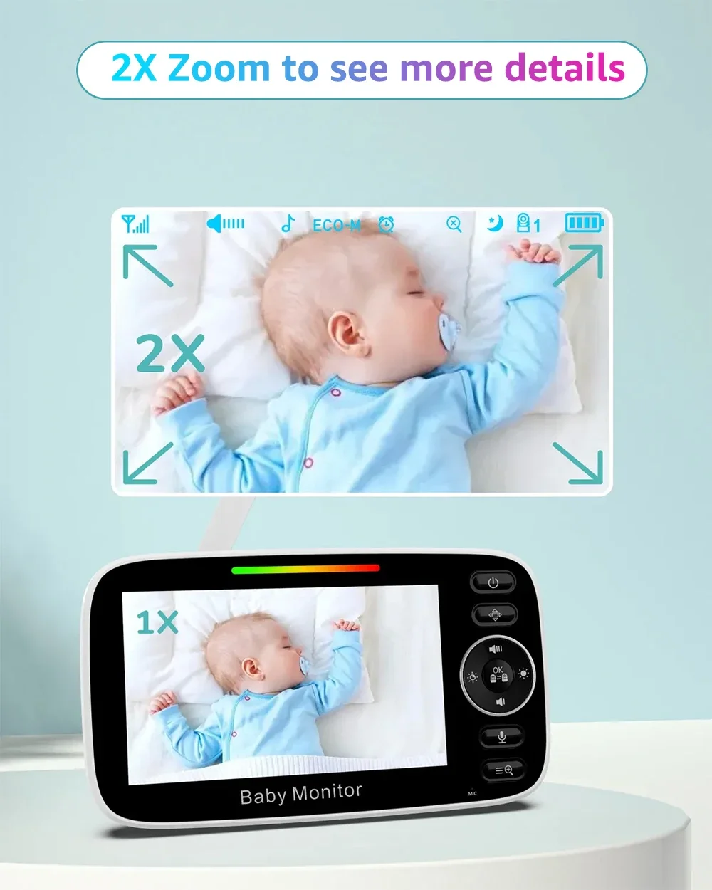 ��【REMOTE 355° PAN and TILT BABY MONITOR & 4.3" COLOR DISPLAY】: Enjoy a 4.3" Screen on this baby camera monitor. Remote control camera rotate 355° in horizontal and 120° vertical gives you a larger view of your baby's room. 2X zoom function ensures clear visuals. Noiseless camera rotation for a peaceful environment.