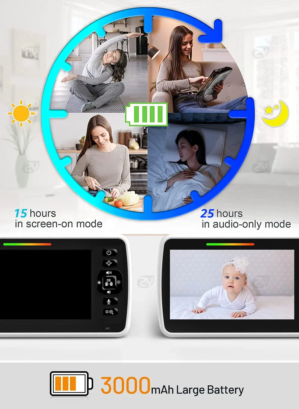 The Wireless baby monitor with up to 10 hours of video streaming on a single charge when you turn on None-VOX mode. Up to 3000 mAh battery, Our portable baby monitor is so easy to use no hassle simply plug it in.