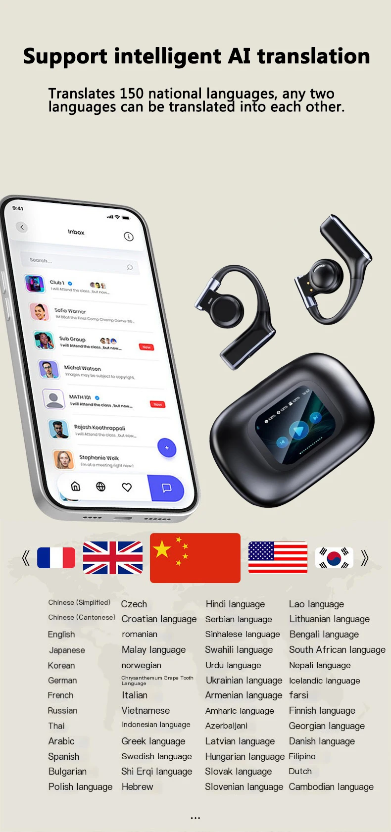Support 150 languages Simultaneous interpretation.Through the screen of the charging case, you can control headphone settings, manage calls and playback, control audio settings and battery level, and set alarms without taking out your phone. Enjoy a truly seamless experience.